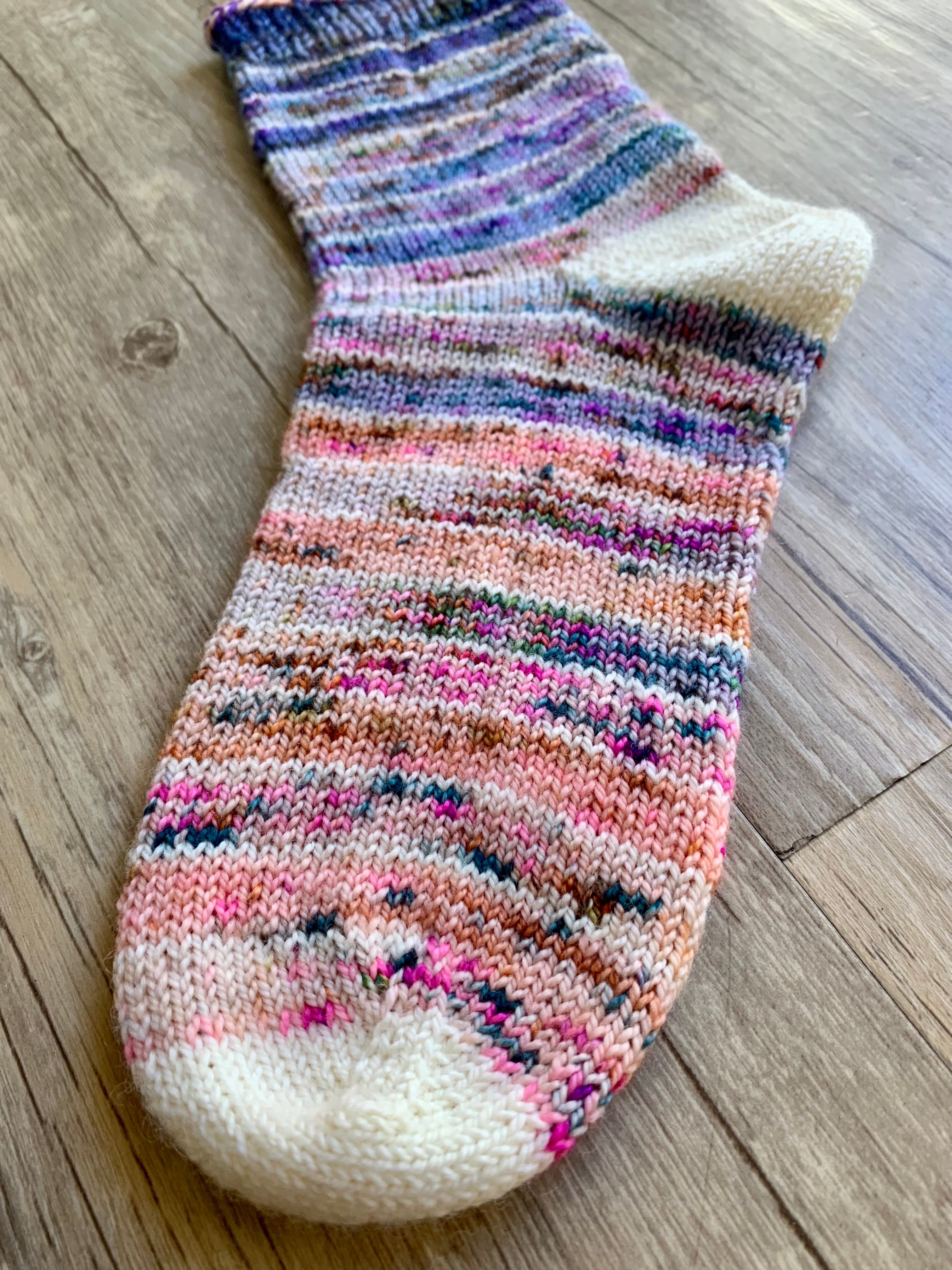Sunset (center) is designed for minis and uses 7 colors total: a 6-color fade plus 1 neutral color. The colorful stripes alternate to form a gradient over the sock starting from the toe and ending at the cuff, broken up by single rounds of the neutral color.