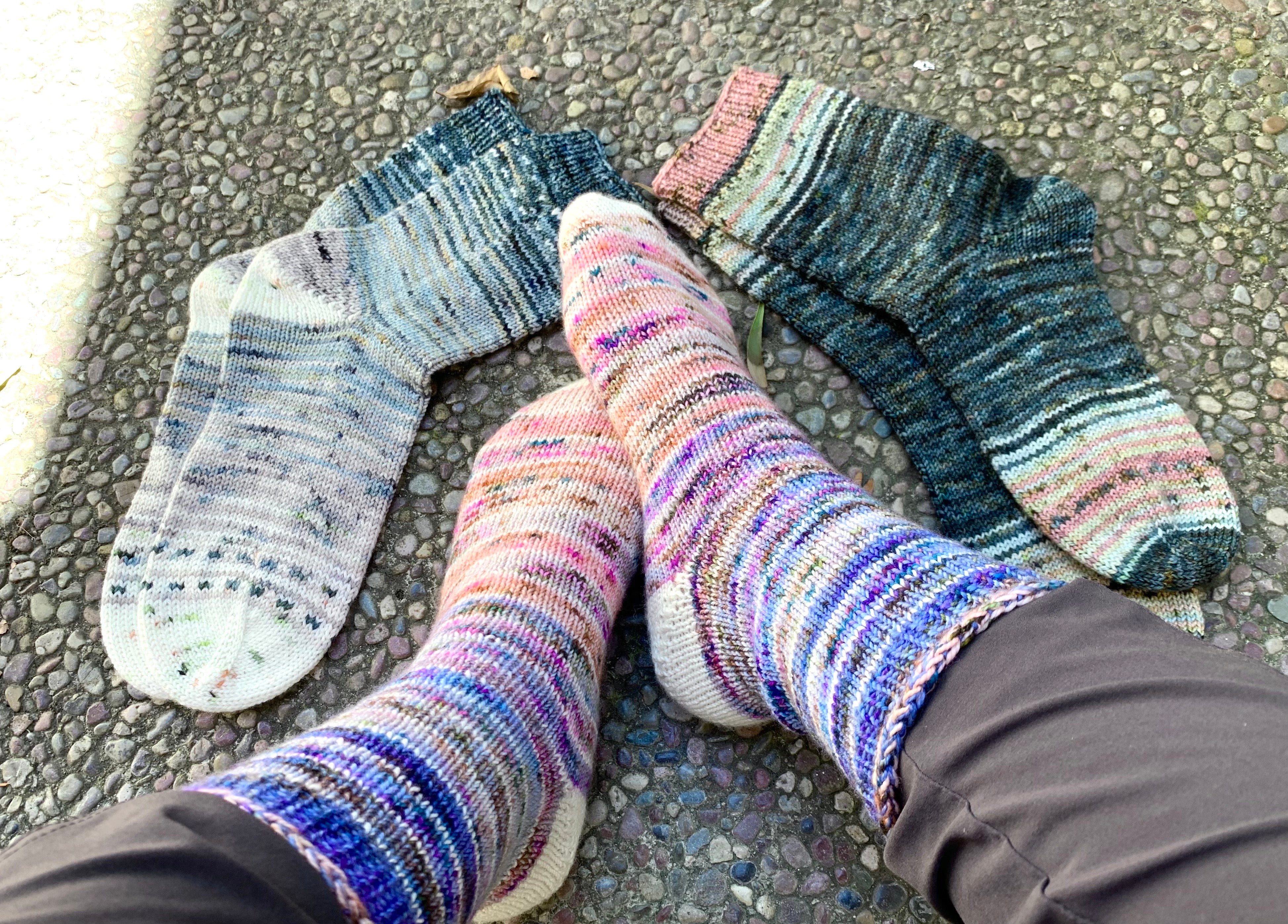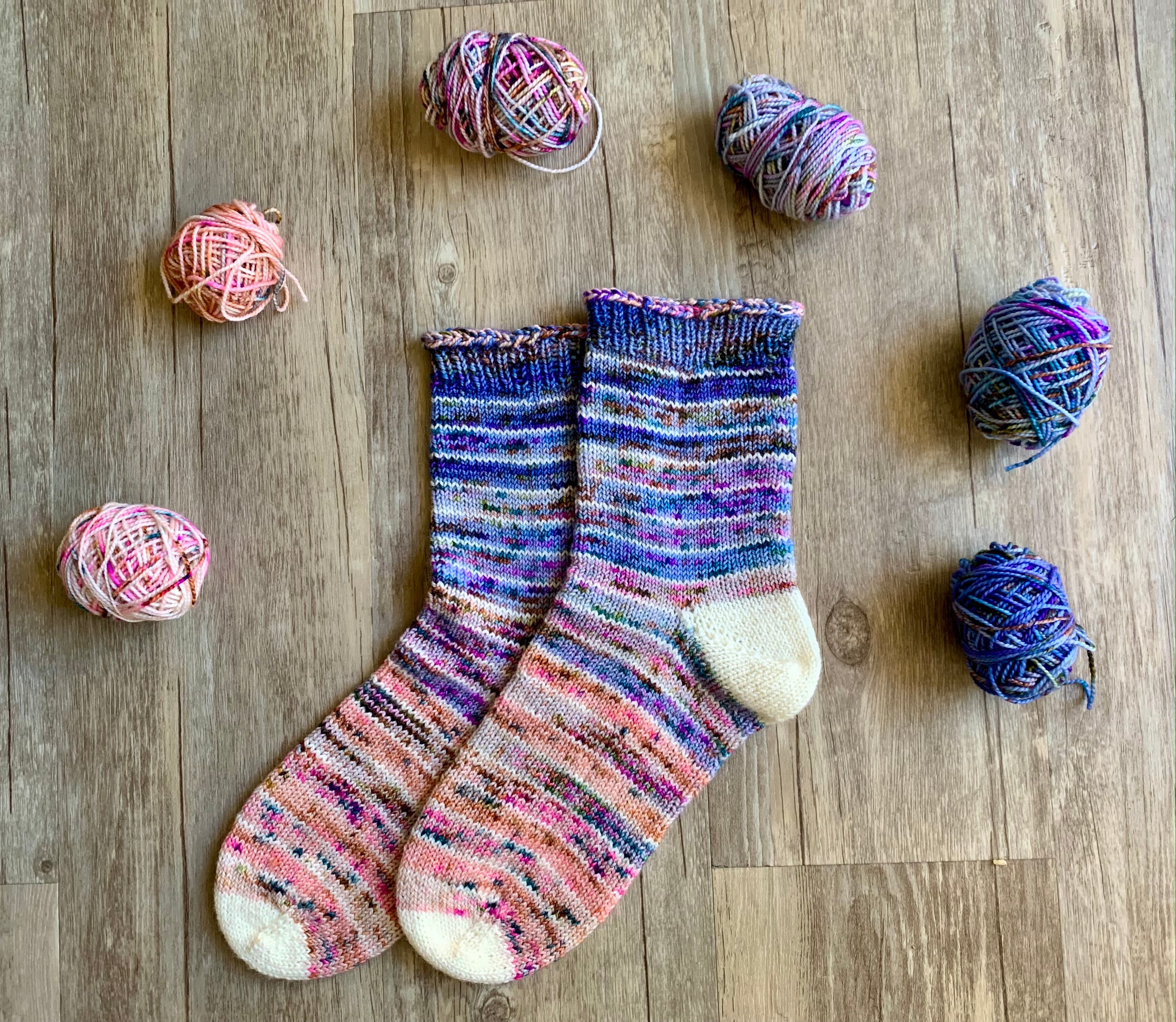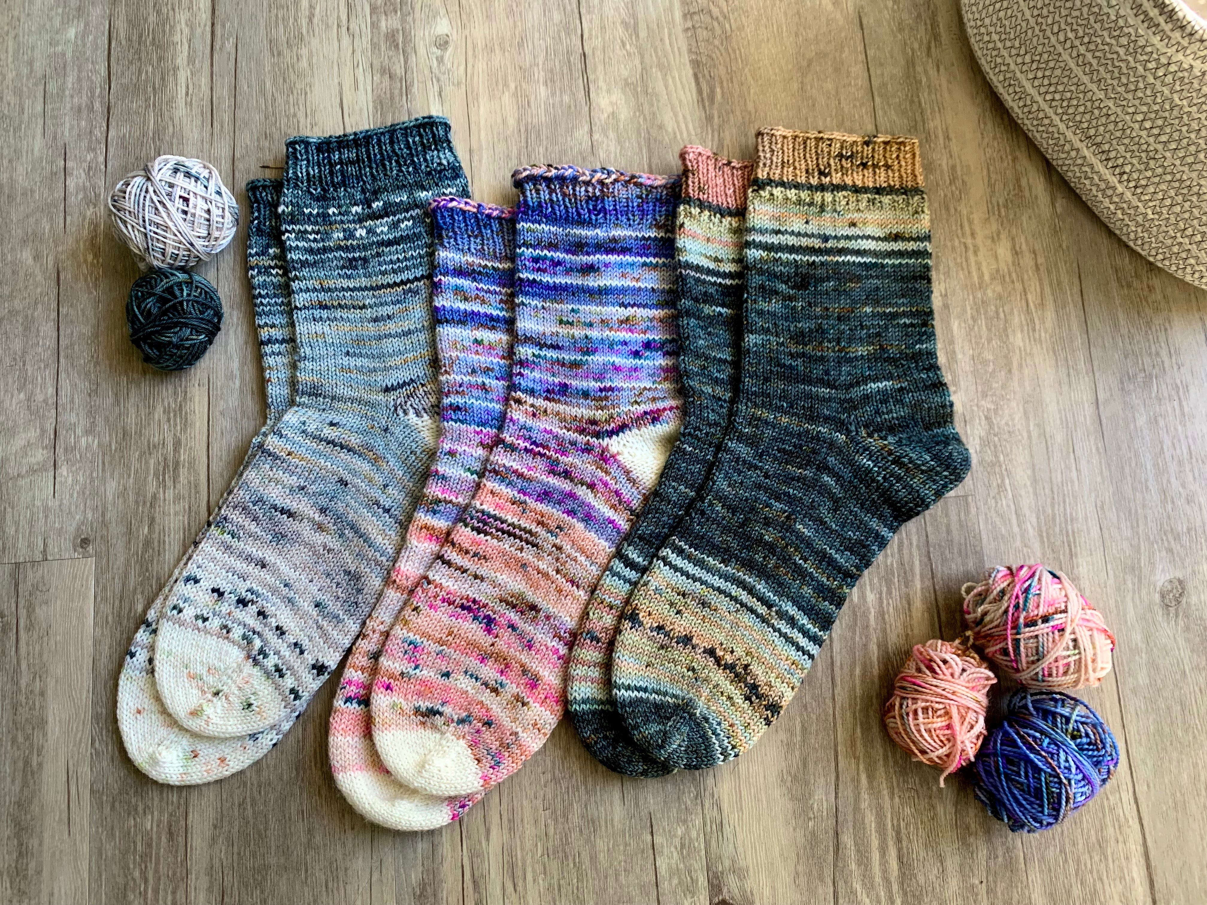 Three sock patterns are included in this set! Each sock style plays with a different type of stripe patterning in different amounts of yarns to achieve unique looks. These are designed to work especially well with variegated and speckled yarns.