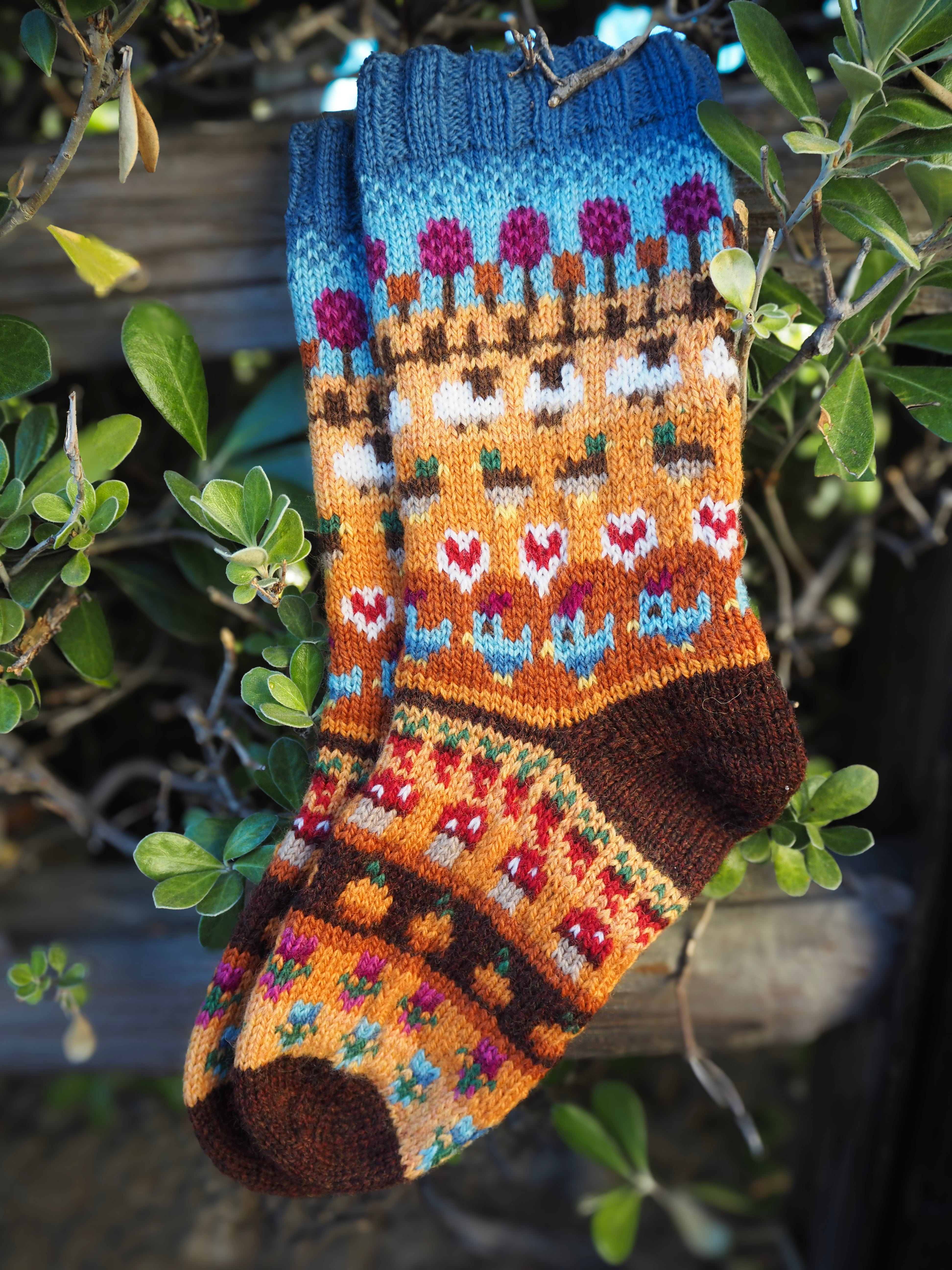 These socks are inspired by the Fall season of Stardew Valley - nurture your farm animals (sheep, ducks, and special blue chickens), harvest your fall crops, and collect some foragables before winter comes (beets, mushrooms, pumpkins, and two colors of fairy rose). Please note this is to purchase the pattern to knit the socks, not the socks themselves. Due to the nature of digital downloads, I cannot offer refunds.