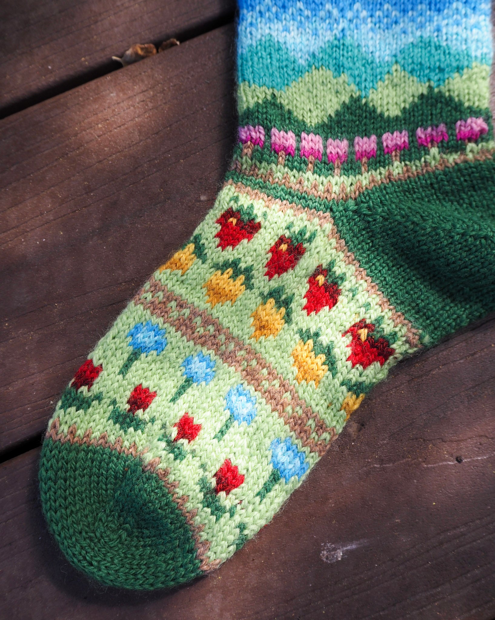 These socks are inspired by the Spring season of Stardew Valley, featuring a mountain landscape with pink spring trees and crops (strawberries, parsnips, blue jazz and tulips). Please note this is to purchase the pattern to knit the socks, not the socks themselves. Due to the nature of digital downloads, I cannot offer refunds.