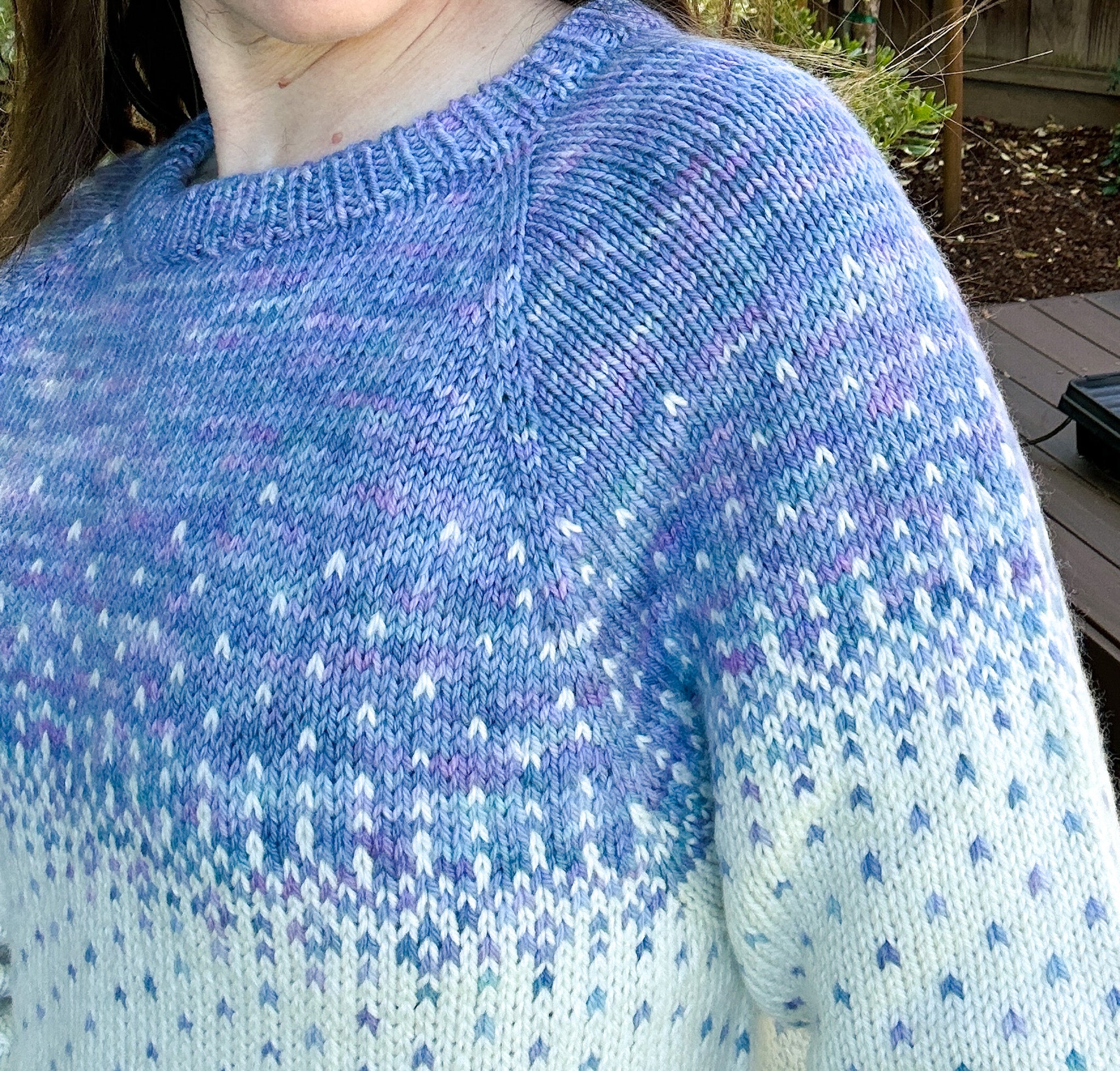 Testers rated this pattern as best suited for an intermediate level knitter or an adventurous beginner. While the colorwork pattern itself is not difficult, working the colorwork at the same time as the raglan shaping means that some previous colorwork and/or sweater knitting experience would be helpful!
