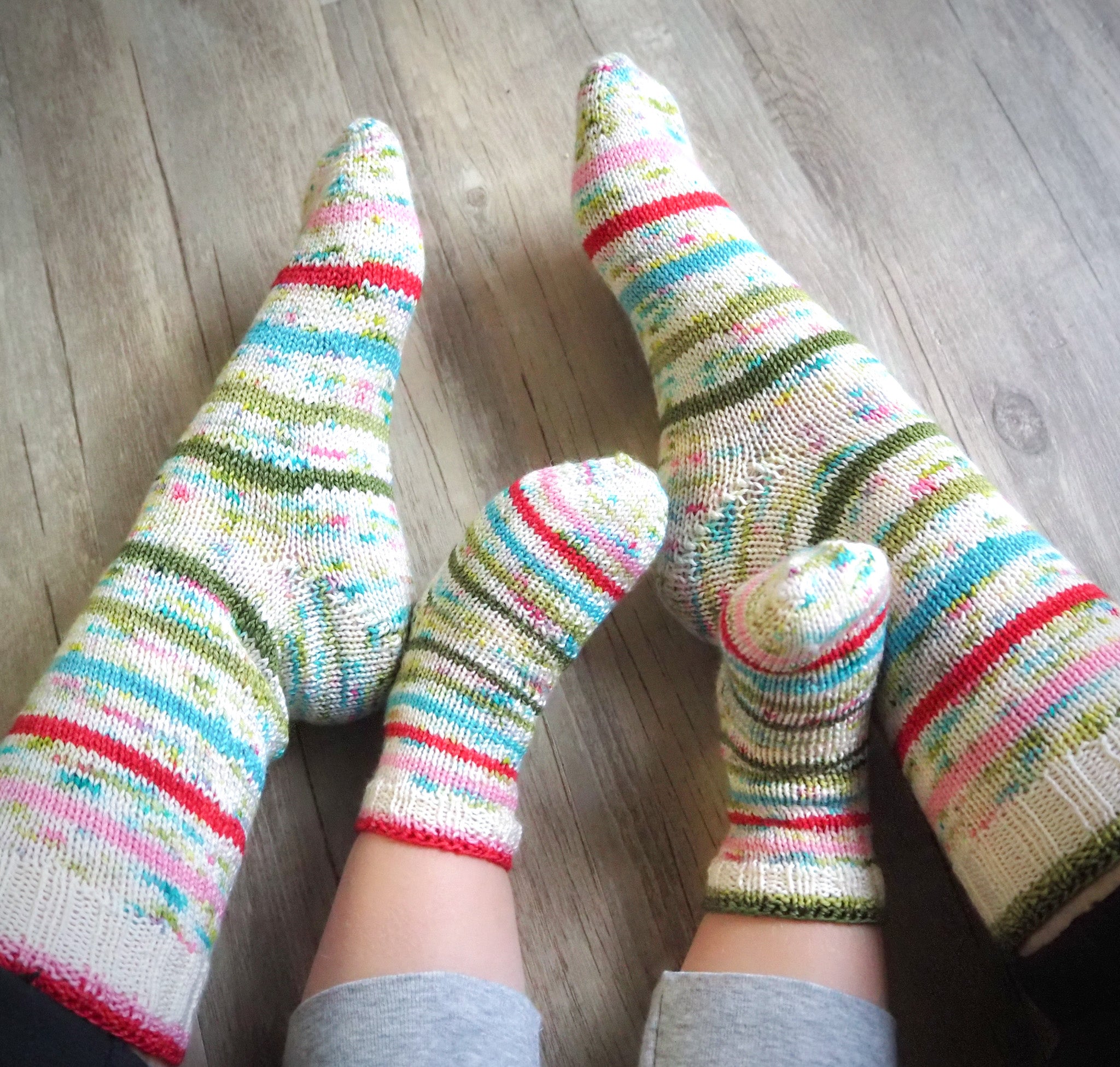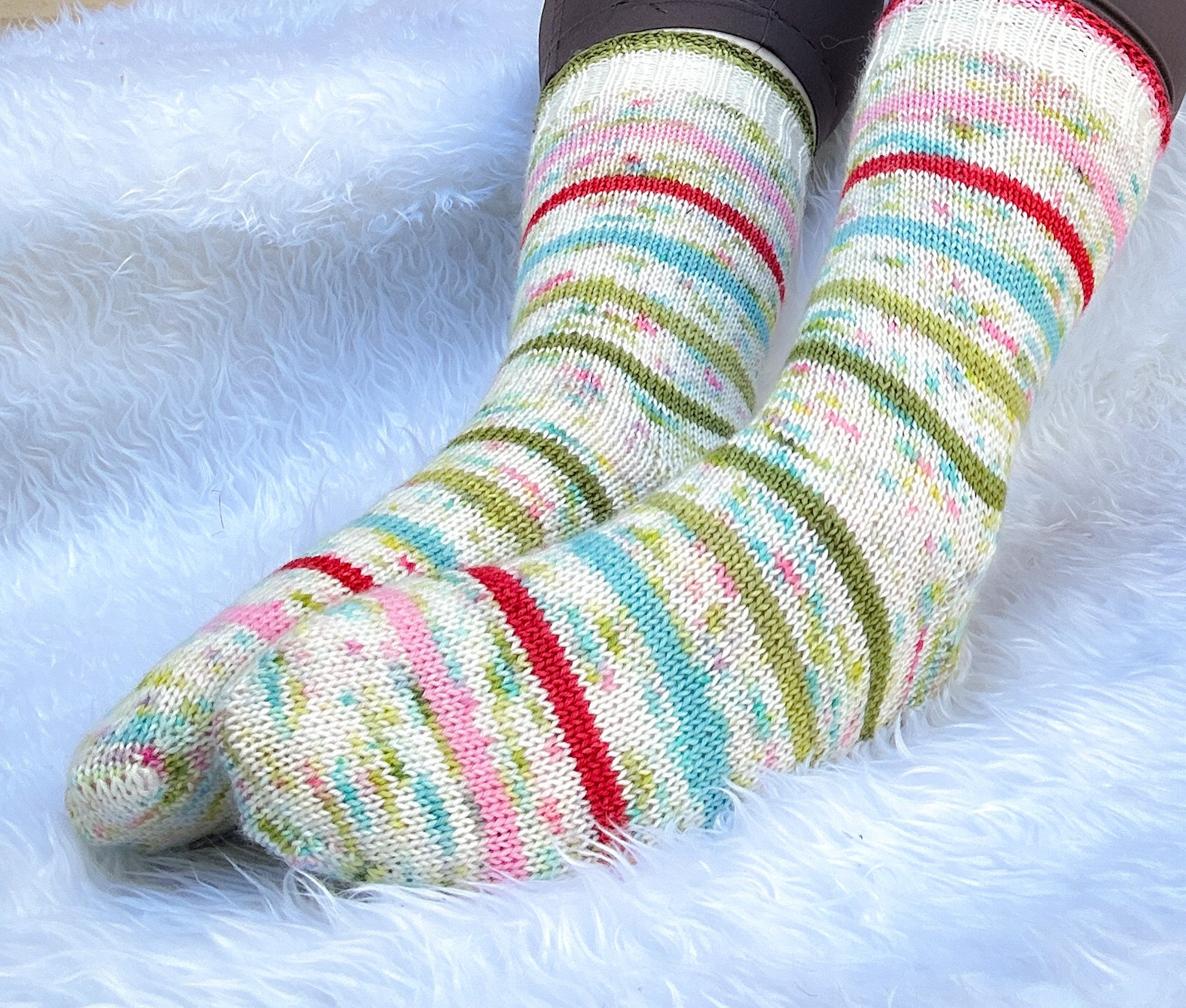 The little splashes of color in this main color reminded me of a scoop of peppermint ice cream, and the stripes on a peppermint stick. These easy socks feature little stripes throughout the foot and leg, and are perfect for sock sets, mini skeins (especially 10g ones), and scraps! This pattern is great for knitters new to changing colors, as instructions for how to do so are included. I remember when I first started knitting, I stuck with one color projects for a long time because I had no idea how you were supposed to change colors! (This was pre-youtube days...). So this is a great pattern for new knitters looking to expand their skill set. Includes 3 child sizes and 4 adult sizes. The widths of the stripes are adjusted to accommodate different foot lengths, while maintaining the look of narrow contrast stripes with wide main color stripes.