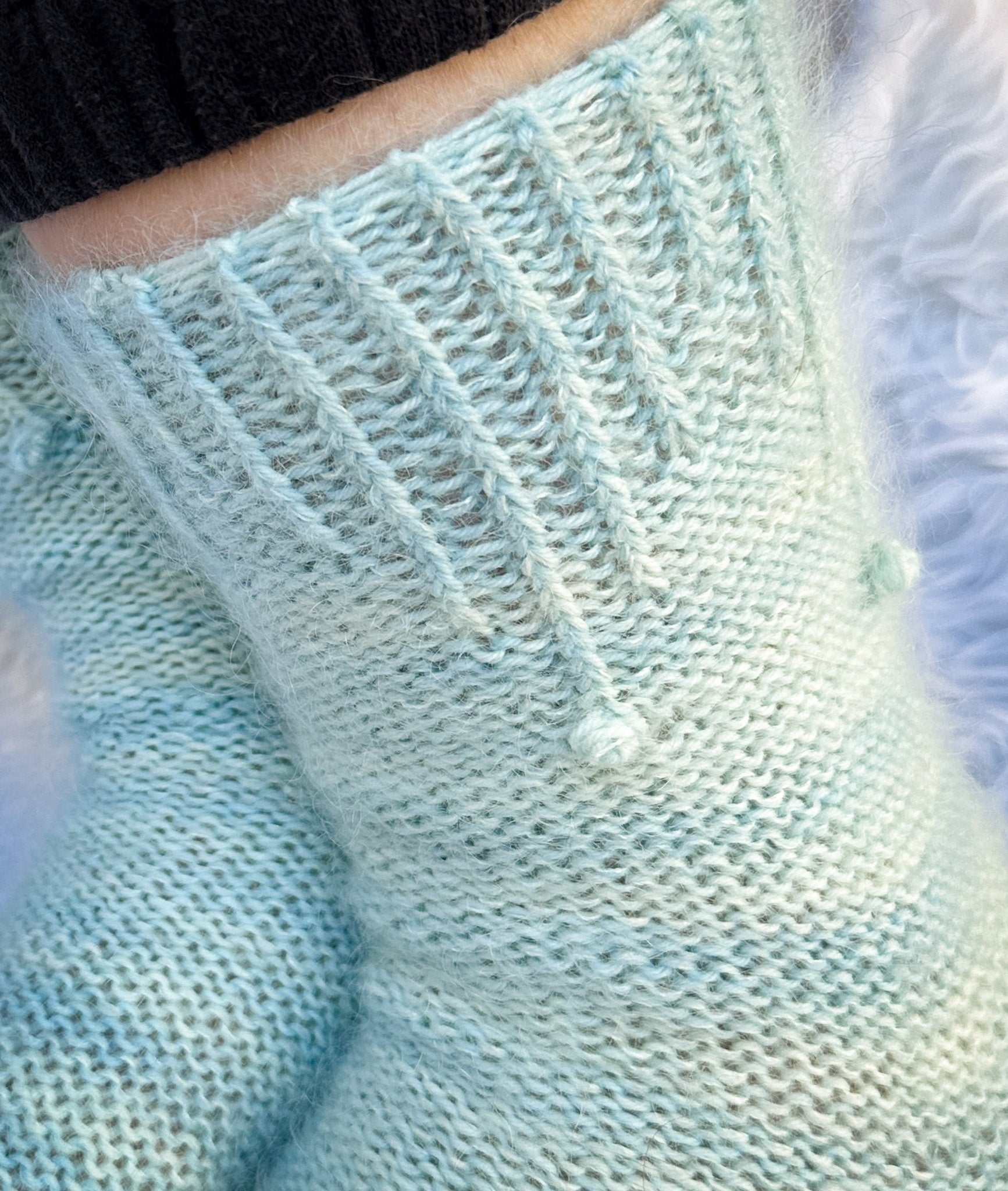 These socks are knit holding fingering weight yarn and mohair together. They are worked cuff-down, starting with an optional tubular cast on and 1x1 half twisted rib cuff. After the leg pattern is worked, the sock is turned inside out so that the reverse stockinette stitch can be worked by knitting instead of purling. The remainder of the leg, heel, and the foot is worked inside out, and then the sock is turned right-side out again to work the toe.