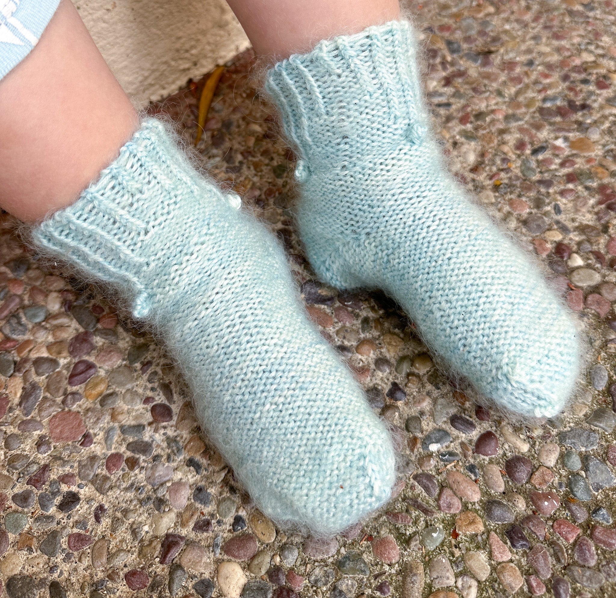 These cozy socks for winter are worked in reverse stockinette stitch with fingering weight held double with mohair, and a twisted rib cuff decoration. Most of this sock is worked inside out so that you are knitting the reverse stockinette stitch. The cool blue color, fuzzy halo, and ribbed design at the top of the leg all reminded me of a melting snow cone. These socks will keep your feet warm on a cold winter’s night. Feel free to sub suri in place of mohair, or omit the mohair entirely and use any heavier weight yarn you get gauge with! Includes 3 child sizes and 4 adult sizes.