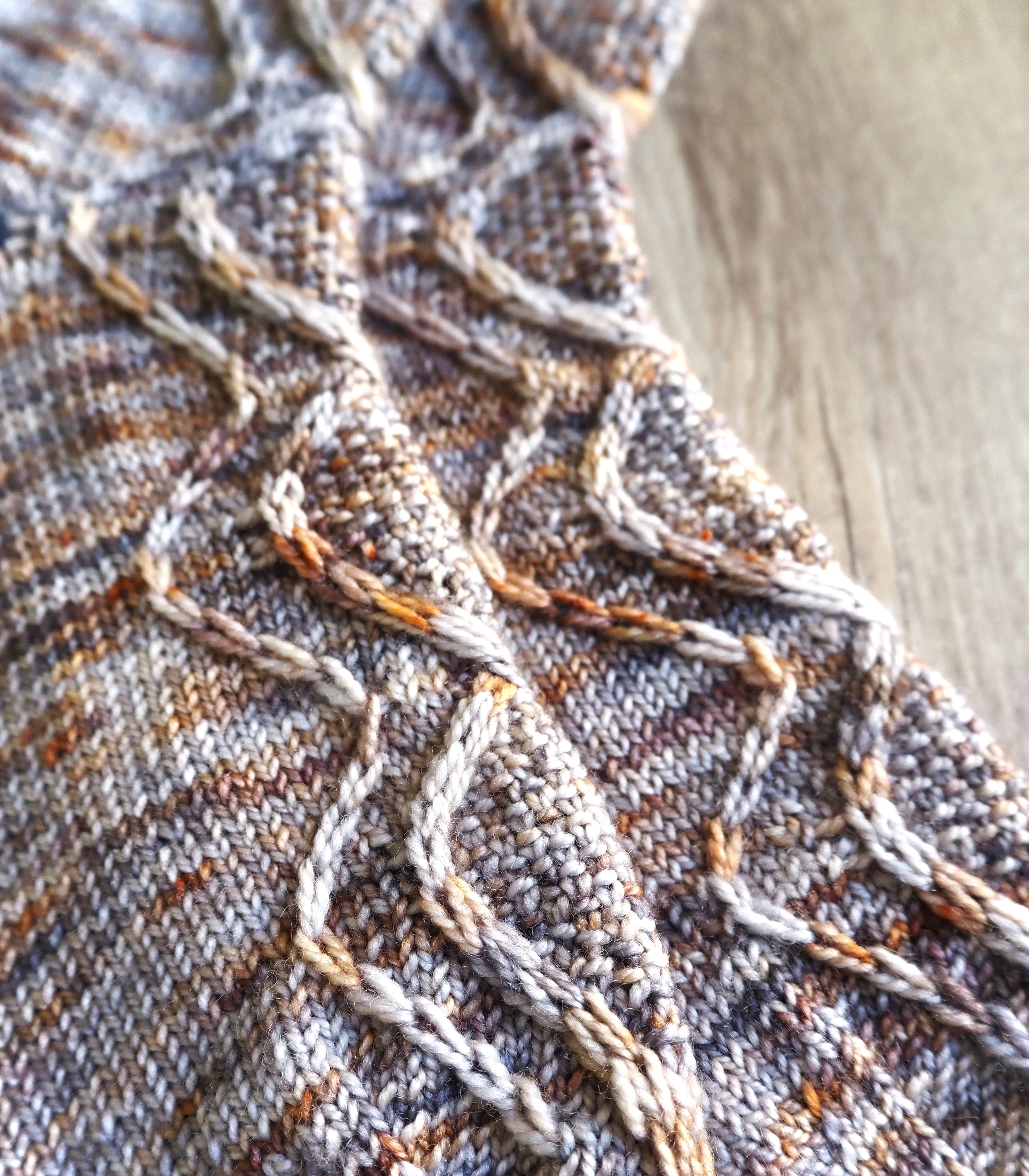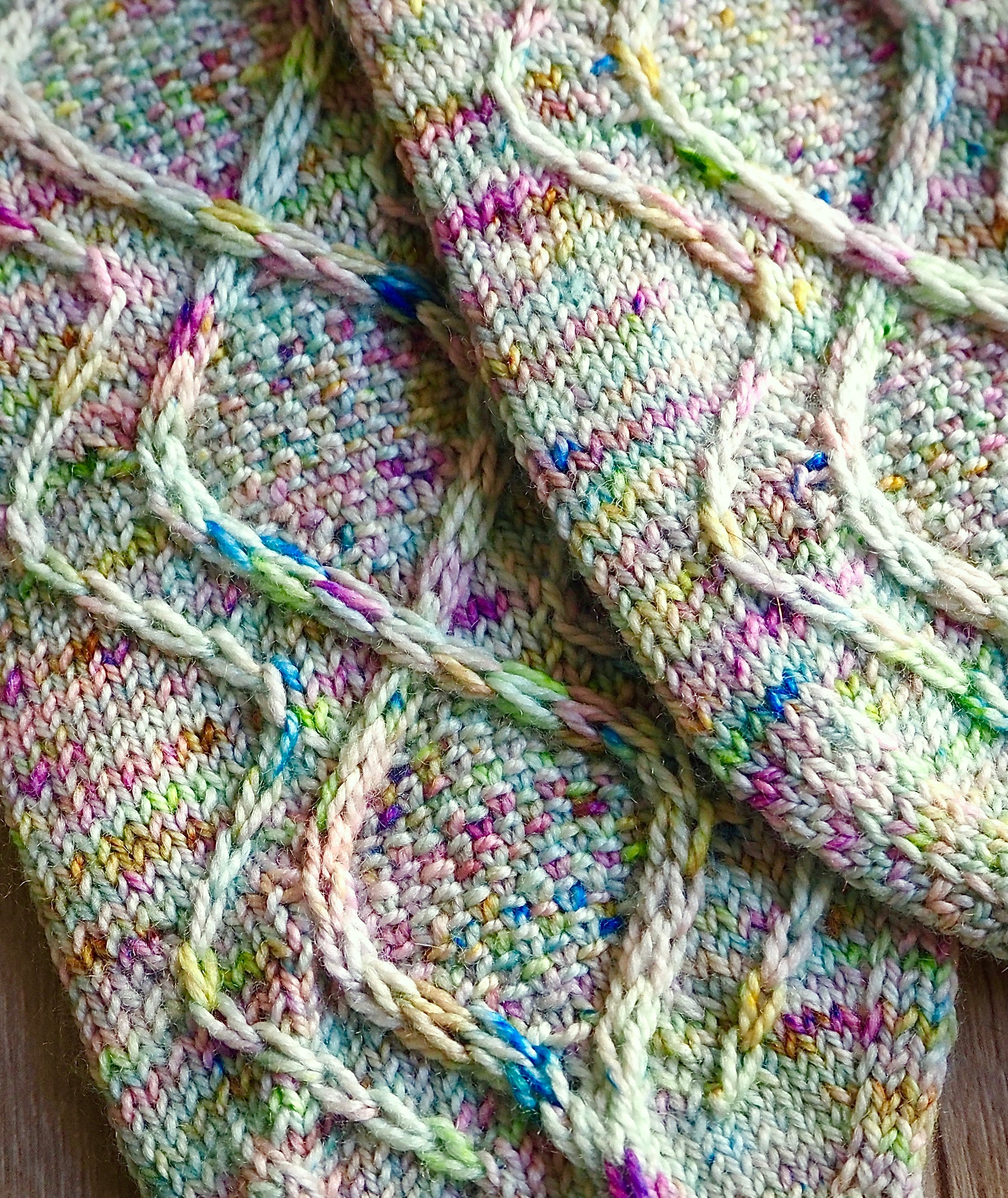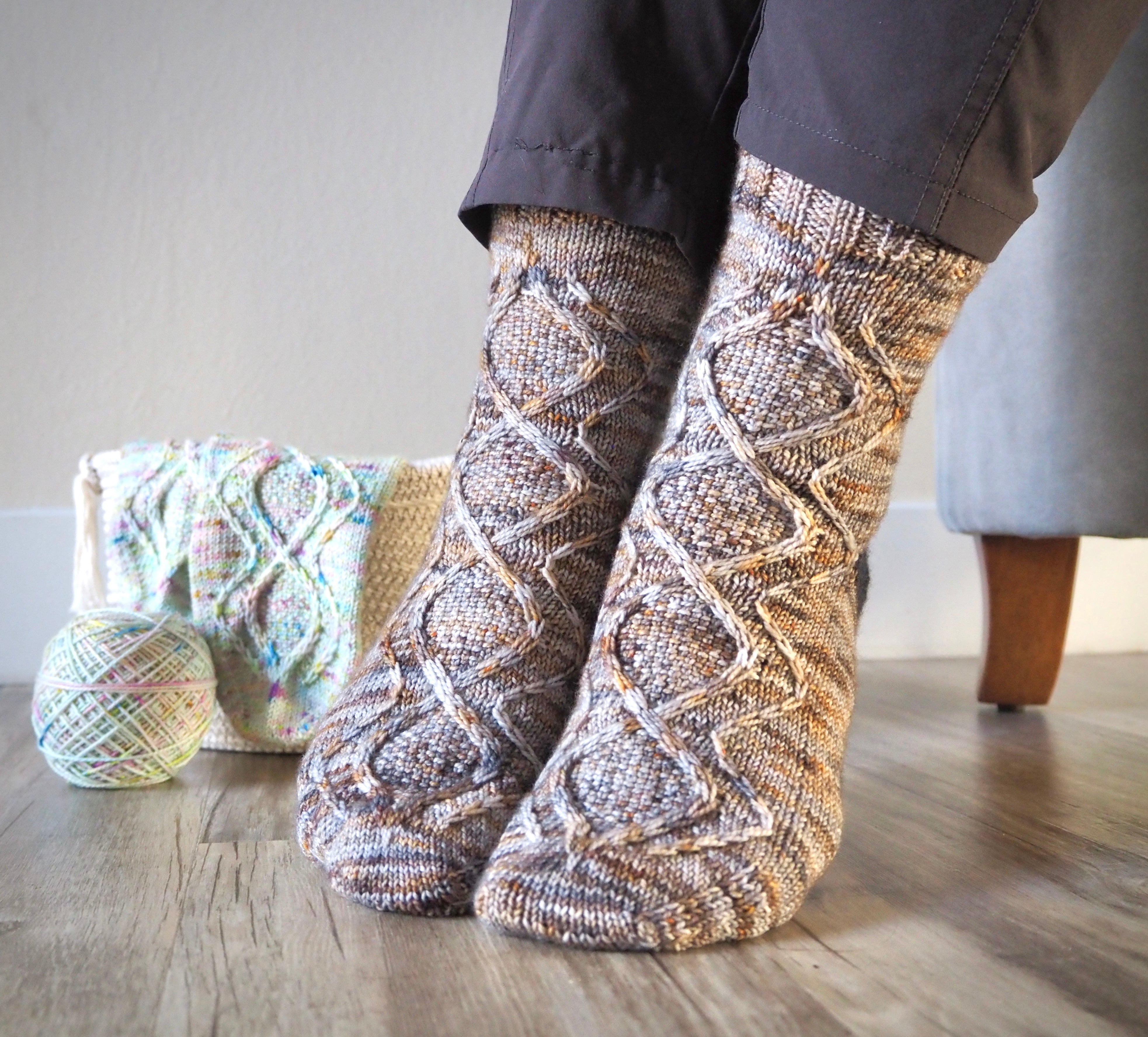 Elongated slip stitches, cable crosses, and linen stitch texture create the winding paths on the front of the sock. This pattern is designed to work best with yarn that has subtle color shifts, which make the slip stitches shine. I recommend using a low contrast variegated yarn with an even spread or semisolid / tonal yarn (yarn that is dyed one color but still has some slight tonal variation) for best results. High contrast yarns that are very busy won’t work as well because all of the color will drown out the design.