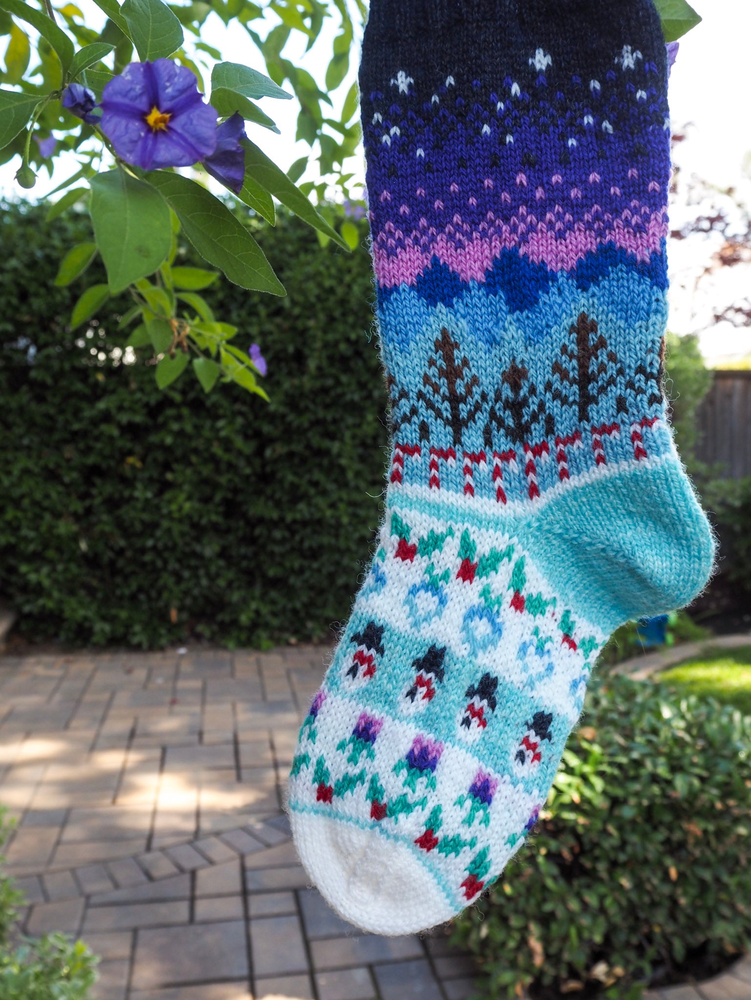 These socks are inspired by the Winter season of Stardew Valley - featuring a nighttime landscape with candy cane decorations, winter forage items (holly, snow yam, and crocus), and festive snowman rarecrows. Please note this is to purchase the pattern to knit the socks, not the socks themselves. Due to the nature of digital downloads, I cannot offer refunds.