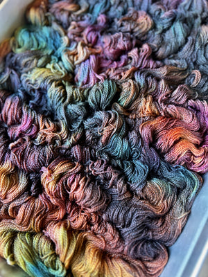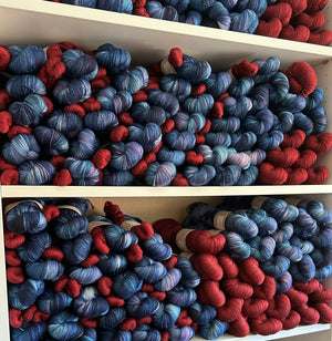 All yarn is dyed by hand in my home garage studio. I use a low-wattage warming cabinet to heat dozens of pans at once while using less energy than a single double burner. I strive to reuse water as much as I can. Once dyed, the yarn is dried in a spin dryer and then hung to air dry.